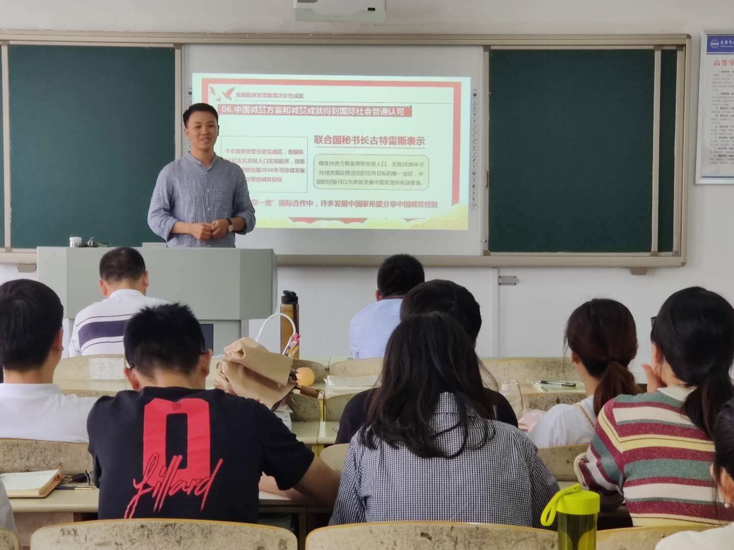 备课会上,李俊、田梦甜和汪健三位老师分别围绕“坚决夺取脱贫攻坚战全面胜利——全面建成小康社会与中国道路”、“坚决打赢疫情防控阻击战和防汛救灾这场硬仗”和“培养担当民族复兴大任的时代新人——坚持把立德树人作为根本”专题作公开课教学展示。李俊老师运用可视化的方法展示十八大以来我国脱贫攻坚取得的显著成就;田梦甜老师结合疫情防控和防汛救灾的感人事例讲解伟大的抗疫和抗洪精神;汪健老师运用细、小、实接地气的方式宣讲习近平总书记关于教育的重要论述。三位老师的公开课展示精彩纷呈,引来了听课教师的阵阵掌声。