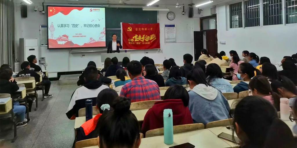 辅导员田梦甜结合思政专业需求,强调学习党史的重要性,以湘江战役为背景进行党史分享。他借助革命先烈陈树湘断肠明志的英雄事迹对同学们进行爱国主义教育,并现场播放《长征》影视片段。“红军不怕远征难,万水千山只等闲......更喜岷山千里雪,三军过后尽开颜。”全体员工齐声朗读《七律·长征》,现场气氛进入高潮。