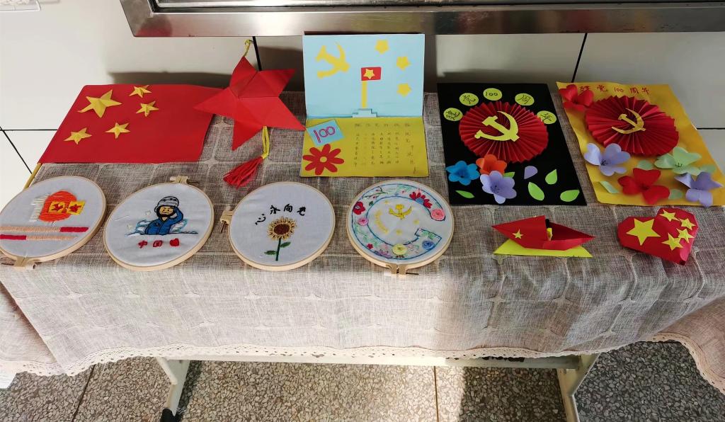 五星红旗、党旗、五角星……在文源楼大厅展出的手工作品琳琅满目,这些作品契合建党百年主题,是拾艺俱乐部成员送给伟大的中国共产党的生日礼物。