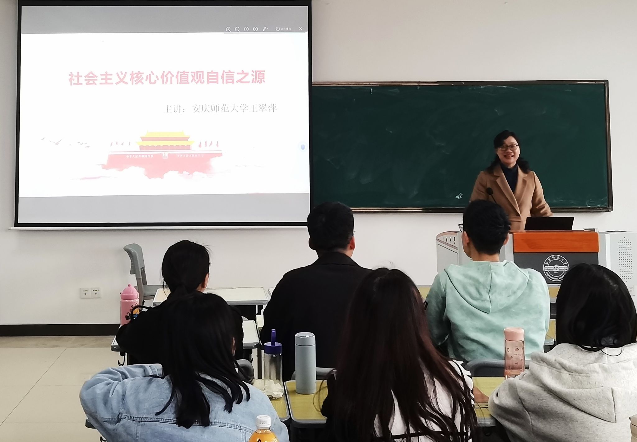 王翠萍主讲的题目为“社会主义核心价值观自信之源”,一方面,她认为思政课要在“信”上下工夫,以信念作为中介;另一方面,她认为思政课教师要学会处理教材,对教材的内容进行转化。她以“何为社会主义核心价值观自信”这个问题为切入点,讲述了社会主义核心价值观的本质。