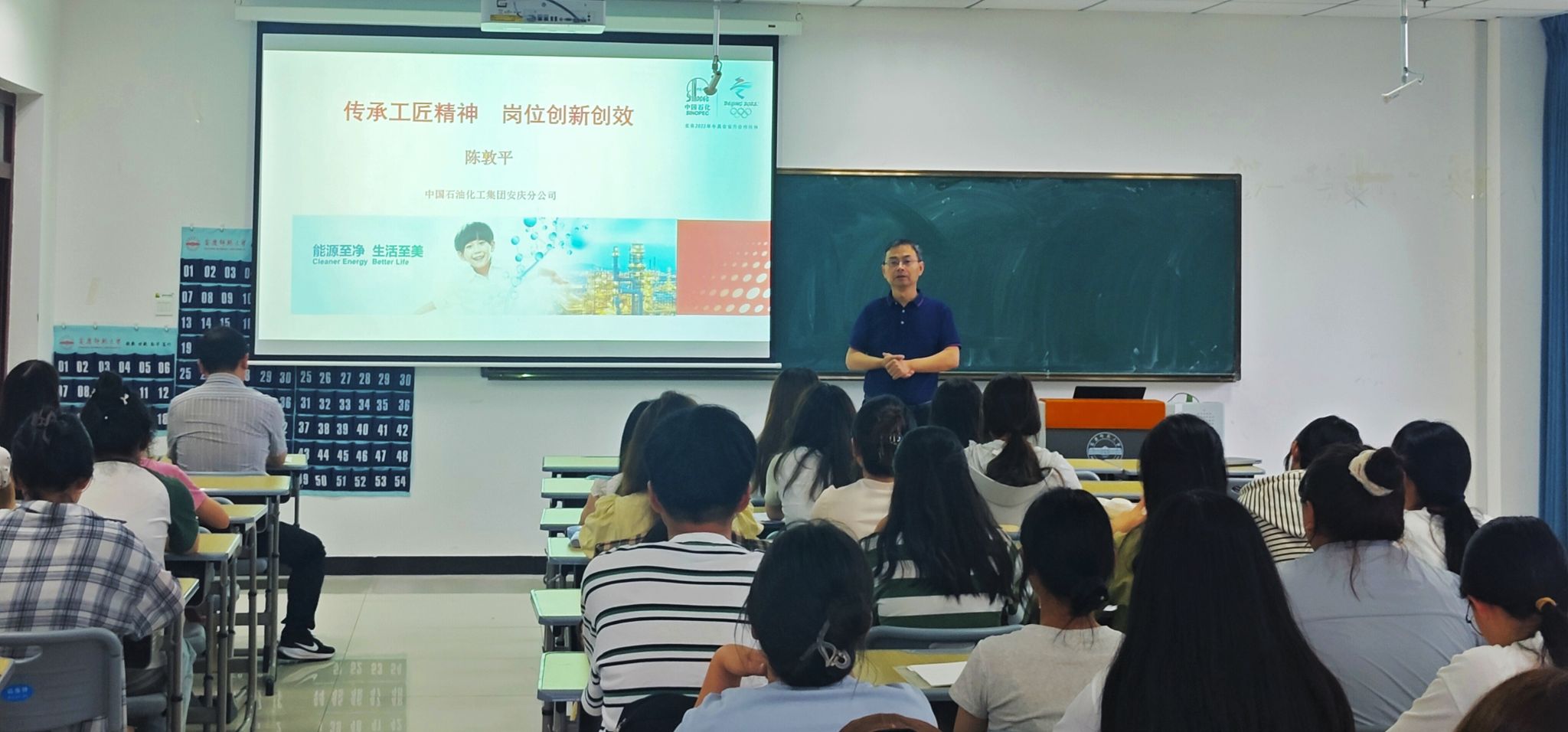 陈敦平为同学们详细介绍了安庆石化公司的企业沿革与后续转型发展,同时分享了自己从初级工到特级技师、技能大师近四十年的成长经历,为同学们展现了自己的初心与追求。他语重心长地告诉全体同学们,要像一颗小小的螺丝钉一样,牢牢扎根在自己的岗位,不让自己生锈,始终坚定如新,努力贡献自己的力量。“一名工匠应当具备高度的责任心,几十年如一日专心把事情做到极致,在实践中练就高超技能,更要不断打破固化思维,勇于创新突破。”陈敦平认为,作为一名企业工匠,要着眼于企业的发展方向,做创新发展的探索者,开拓创新思路。他通过分享许多工匠前辈的事迹,号召同学们要爱岗敬业、刻苦钻研,用实际行动践行工匠精神。