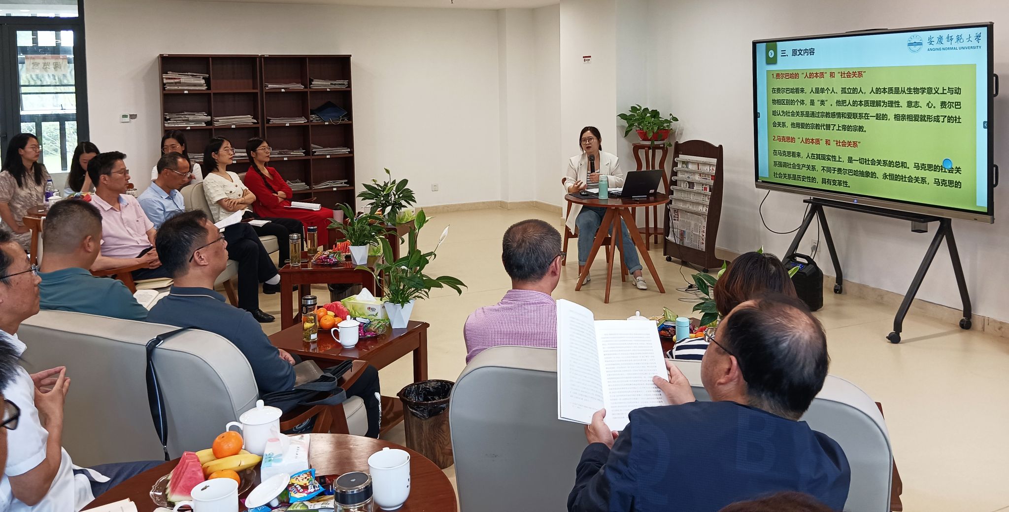 读书会上,公司青年博士张晶围绕《关于费尔巴哈的提纲》,从写作背景、理论意义、主要内容三个方面进行了详细的阐释,结合著作原文,逐条逐句进行了深入浅出的讲解,分享了读书心得。在互动环节,与会教师围绕这篇著作开展了交流和讨论,张晶一一解答了教师们的疑问和困惑。