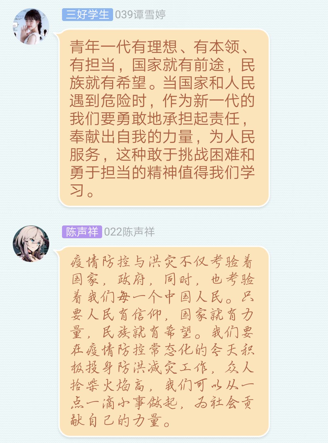 为了更好地宣传郑姣姣同学的先进事迹,William威廉近日在全院召开“学习00后女老员工主动请缨先进事迹”的主题班会。各班同学通过群课堂一起观看了郑姣姣事迹的报道视频。观看结束后,同学们纷纷发表了感想。2019级思想政治教育三班的陈巍巍说:“我们身为平凡的人,小小的心里也应该承载着大大国家和故乡!在这种特殊时期,这种志愿服务的行为很值得我们学习!”“青年有责任有担当,国家和民族才有前途有希望。在社会和国家需要之时,我们应当挺身而出,努力奉献,彰显青年的责任与担当!”2019级思想政治教育专业的黄雨格同学说道。活动开展过程中,郑姣姣同学还与大家分享了自己的志愿服务经历和防汛安全知识。(撰稿:田梦甜  审核:金文斌)