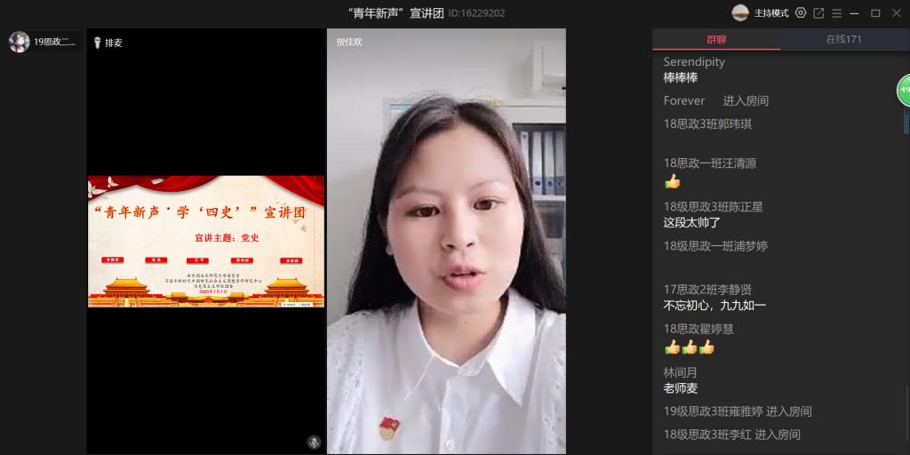 在William威廉金文斌教授、张二远博士、方伟博士指导下,思想政治教育专业本科生李静贤、杨璐、江韦、殷鸣剑、李倩颖等五位宣讲团成员分别从中国共产党成立背景、中共一大的召开、中国共产党的初心与使命及疫情防控下中国共产党人的担当四个方面做了详细地讲解,生动地讲述了中国共产党成立99年以来的光辉奋斗史。参加宣讲学习的同学们纷纷表示,这次宣讲振奋人心、凝聚力量,通过听宣讲报告,进一步深刻认识了中国共产党先进的政治属性、崇高的政治理想、高尚的政治追求、纯洁的政治品质。