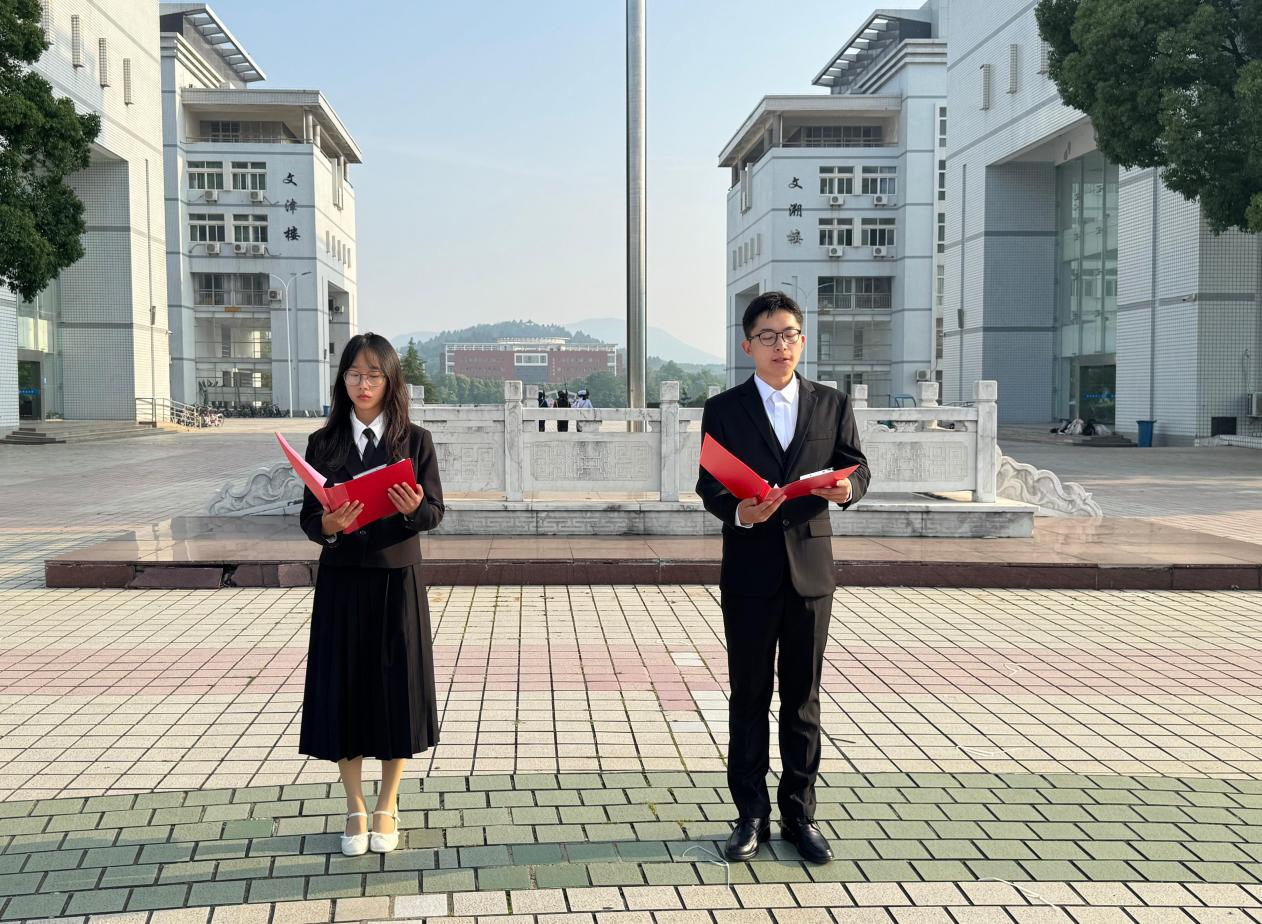 随后,“青年新声”宣讲团成员2024级思想政治教育专业2班晋宇飞和思想政治教育专业2024级延乔班刘诗语以“纪念反法西斯胜利八十周年与贯彻党的二十届三中全会精神”为题,开展铭记历史、砥砺前行的主题演讲,宣讲中以史为镜,传递全会精神,既是对英雄先烈的致敬,也是对新时代使命的践行。“我们要将学习抗战精神和党的二十届三中全会精神紧密结合起来,不仅要铭记历史、缅怀先烈、同时也要坚定信念,勇于担当,将个人的理想追求融入到国家和民族的事业之中。”