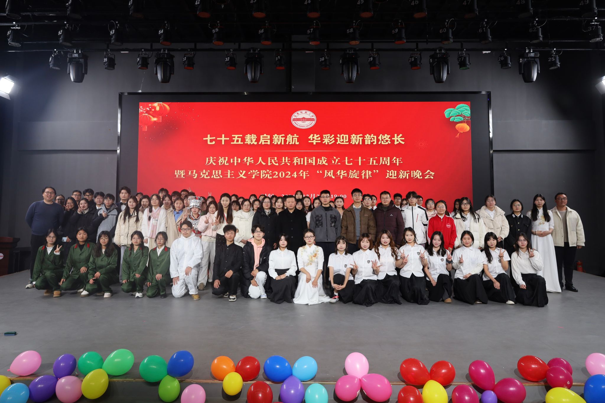 迎新晚会分为“岁月织锦,新梦启航”、“华章初展,韵长流芳”、“华彩艺韵,青春榜样”三个篇章,包括话剧、舞蹈、歌曲等表演形式在内的11个节目。团委艺术中心舞蹈队带来了开场舞《寄明月》,节目《民族之花》让民族传统服饰在舞台上焕发生机活力。话剧《不朽的第一课》带领观众走进峥嵘岁月,歌颂革命英烈,领略时代精神。两位藏族员工带来的朗诵节目《守望相助,格桑花开》向观众传达了民族团结精神,话剧《山那边》带领观众回忆革命年代那段刻骨铭心的历史。由2023级思想政治教育专业延乔班陈静带来的歌曲《一路生花》,荧幕上公司学子考研路上的奋斗时刻与她坚毅又深情的歌声交织,娓娓道来了一段关于奋斗的故事。晚会最后,公司师生代表共同合唱《我爱你中国》,在慷慨激昂的歌声中,晚会圆满结束。