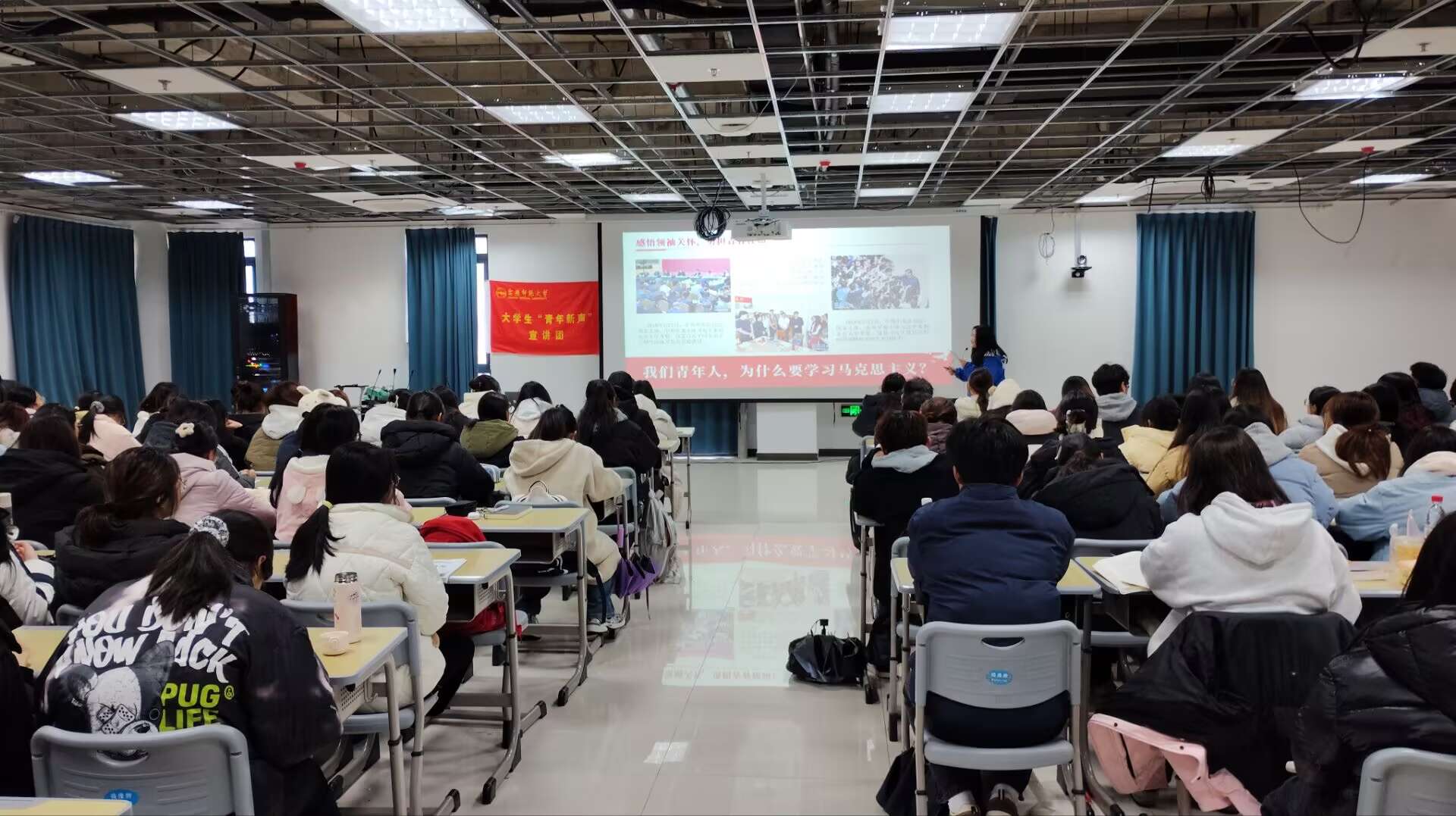 “青年新声”宣讲团成员以《挺膺担当奋青春,奋楫笃行向未来》为题,通过讲述习近平总书记对青年的关怀寄语,深刻阐述了新时代青年所肩负的责任与使命。在宣讲过程中,宣讲人员紧紧围绕“忆往昔、观当下”、“我辈青年为何奋斗”与“我辈青年如何奋斗”展开,强调要用“真学、真懂、真信、真用”的态度坚持学习马克思主义。宣讲人员呼吁广大青年要为实现个人价值、满足社会发展的需要、承担社会责任与使命而奋斗,鼓励青年们在新时代要肩负时代责任、锤炼品德修为、练就过硬本领、赓续奋斗精神、厚植国家情怀。
