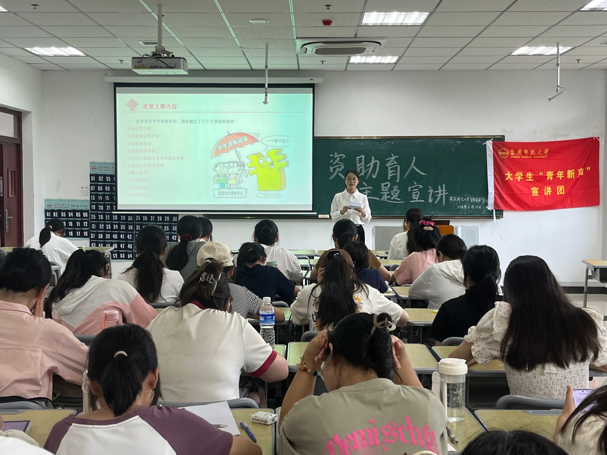 6月12日,老员工“青年新声”宣讲团于Q308教室举办主题为“奋进新征程,领跑筑梦路”的资助育人项目主题宣讲活动,获得国家助学金、国家励志奖学金的100余人聆听宣讲。
