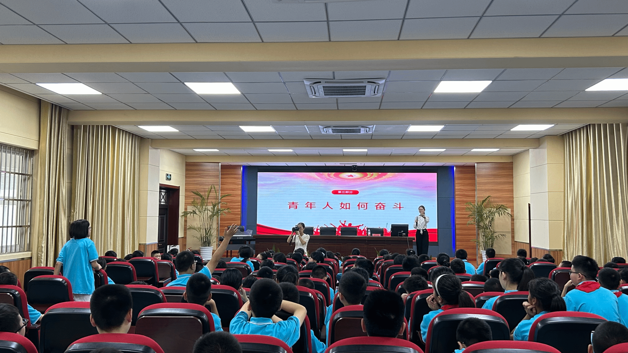 “青年强,则国家强。青年是祖国的未来、民族的希望,也是党的未来和希望……”在安庆二中南区,田文博、周扬帆、孟圆圆三位成员分别上台为刚刚开学的初一新生进行理论宣讲。在宣讲过程中,宣讲团成员周扬帆引用国家高级技师何小虎为国防事业做出突出贡献的事迹,以此勉励青年学子们努力学习,报效祖国。
