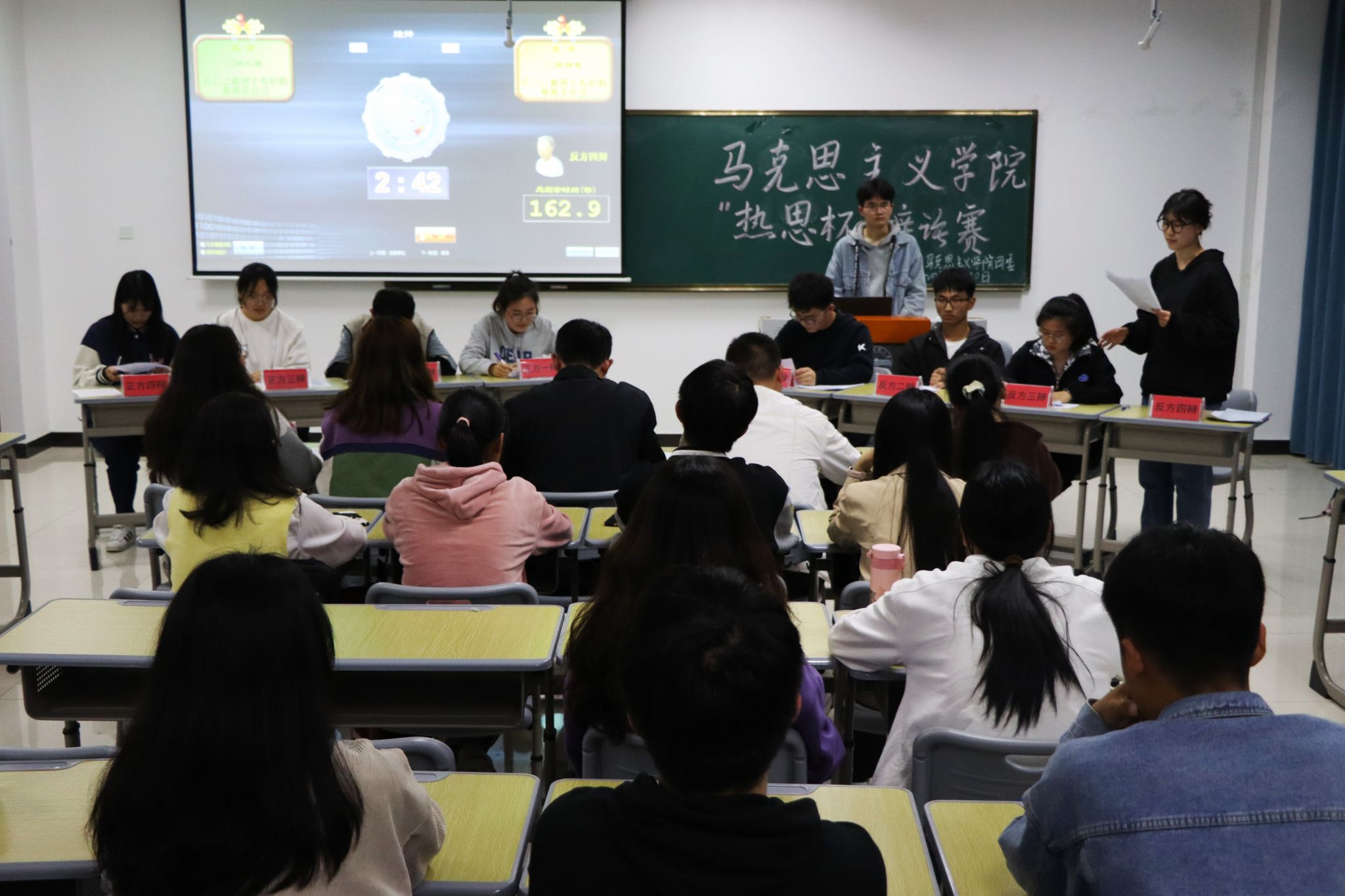 立论质询、自由辩论、总结陈词、观众提问……每场比赛均有8个环节,在规定时间内依次进行。经过两轮激烈角逐,思想政治教育专业2022级(1)班夺得桂冠,(2)班与(4)班分获亚军和季军,杨彤彤、徐彤、温欣榕三位员工获评“最佳辩手”。